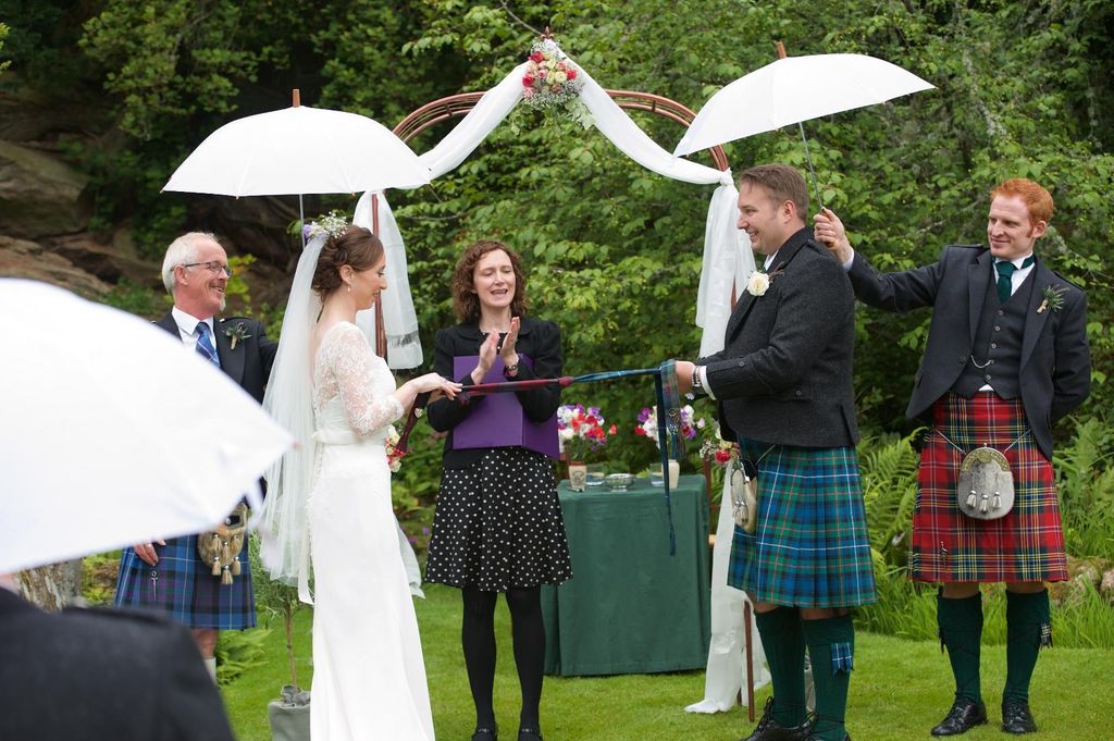 Tartan from each family, detail embroidered on each ribbon and with a ring and locket from the absent grandparents embroidered on with silk twist. Handfasting is the symbolic act of a couple’s hands being tied together using cord or other strips of meaningful cloth or ribbon. The primary idea is a symbolic binding of the hands during the wedding ceremony, often before the bride and groom make their vows to one another; sometimes as a ‘stand alone’ ritual leading up to the pronouncement of marriage. This is an adaptation of a ritual which has been known the world over through many different periods in history and by different faiths and cultures.